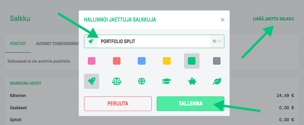 Uusi salkkunäkymä näkyy nyt välilehtenä Salkku-sivun Yleiskatsaus-näkymän vieressä, ja voit vaihtaa näiden välilehtien välillä. Jaotellaksesi positioita salkkunäkymään, klikkaa sivun oikeasta yläkulmasta Jaottele positiot.